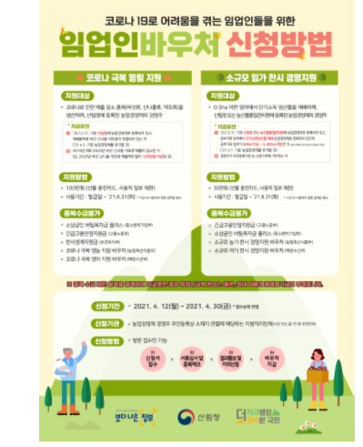 소규모 임가 한시경영지원 바우처는 코로나19 피해에 취약한 0.5ha 미만의 임야에서 단기소득임산물을 재배하는 농업경영체 경영주 10,000임가에 30만 원씩 선불카드 형식으로 지원한다.