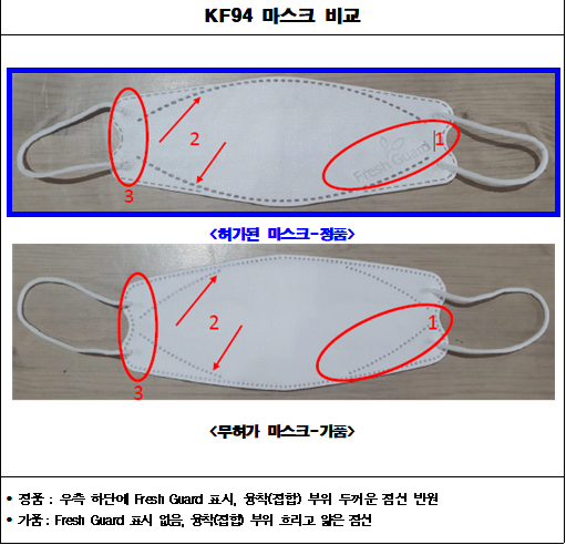 A업체는 더위로 비말차단용 마스크(KF-AD) 수요가 증가하던 지난해 7월 1일부터 7월 30일까지, 시중에서 구입한 공산품 마스크를 자사의 비말차단용 마스크 포장에 넣어 574만개(시가 17.1억원 상당)를 제조·판매했고 이어 A업체는 지난해 8월 25일부터 10월 13일까지 허가받지 않은 C업체에 허가받은 보건용 마스크 포장지를 제공하고 무허가 보건용 마스크(KF94) 566만개(시가 26.2억원 상당)를 제조하게 하여 유통업체와 함께 판매했고, 식약처는 이 중 113만 8,000개를 압류했다.