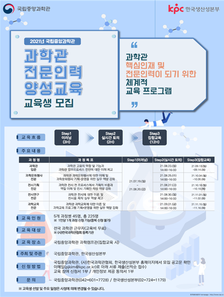 과학관 전문인력양성 사업은 전국 국·공·사립 과학관 근무자 등을 대상으로 비대면(e-learning) 교육(7월~8월)과 대면(집합)교육(9월~11월)의 혼합교육으로 오는 7월부터 11월까지 총 5개 과정 225명의 교육생을 대상으로 운영하며, 6월 23일부터 교육생 모집을 시작한다.