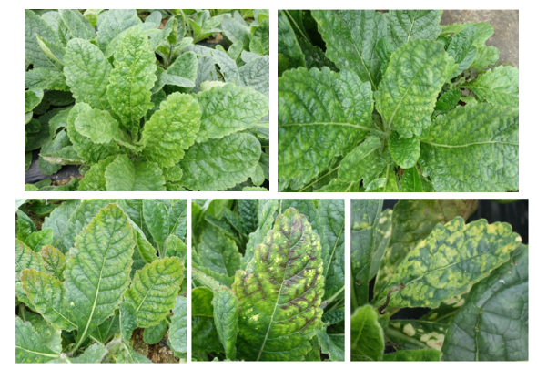 즙액으로 전염되는 이들 바이러스에 감염되면 지황 잎에 누런 얼룩무늬가 나타나고 잎맥이 붉게 변한다. 특히, 종근(씨뿌리)까지 바이러스가 침투하므로 다음 세대까지 전염이 우려된다.