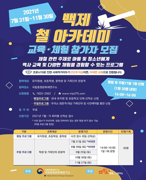 우리나라 철의 역사와 문화를 알고, 직접 철 만드는 과정을 체험하는 기회를 제공하기 위해 마련된 『백제 철 아카데미』는 지난해 11월 준공한 ‘제철기술 복원실험장’을 활용하여 유치원생, 초등학생, 중학생과 가족 단위를 대상으로 한 맞춤형 제철체험 프로그램이다.
