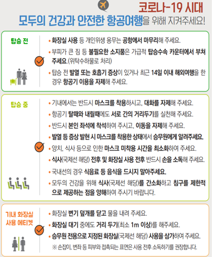 국토교통부는 안전한 항공교통 이용을 위해 승객들이 기내에서 마스크 착용, 대화자제, 좌석 이동금지, 화장실 사용 후 손 소독, 식음료 섭취제한 등 코로나19 감염예방을 위한 기내 에티켓 준수와 함께 비행 중 승무원의 방역활동에도 적극 협조해 줄 것을 당부하였다.