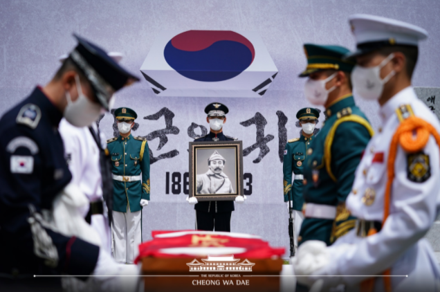문 대통령은 18일 대전현충원에서 거행된 홍범도 장군 유해 안장식에서 “봉오동 전투와 청산리 전투 101주년, 장군이 이역만리에서 세상을 떠나신 지 78년, 참으로 긴 세월이 걸렸다”면서 “유해봉환을 위해 적극 협력해주신 카자흐스탄 정부와 고려인 동포 여러분께 깊은 감사의 마음을 전한다”며 소회를 밝혔다.