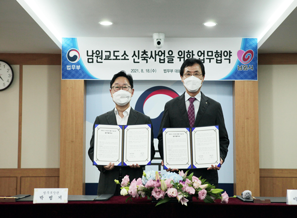 이날 협약식은 박범계 법무부장관, 유병철 교정본부장, 이환주 남원시장, 양희재 남원시의회 의장 등이 참석한 가운데 진행되었으며, 과밀수용 완화 및 남원시 지역발전을 위해 남원교도소 신축사업이 원활하게 추진할 수 있도록 양 기관이 적극적으로 협력하기로 했다.