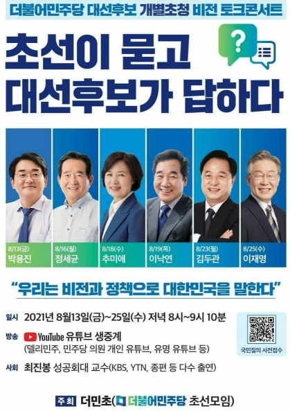 한편 이번 더민초 초청 이재명 후보 비전토크콘서트는 민주당의 공식 유튜브 채널인 델리민주와 함께 민주당 초선의원의 개인 유튜브 방송으로 동시 송출될 예정이며 후보별로 선정한 파워유튜버도 생중계할 예정이다.
