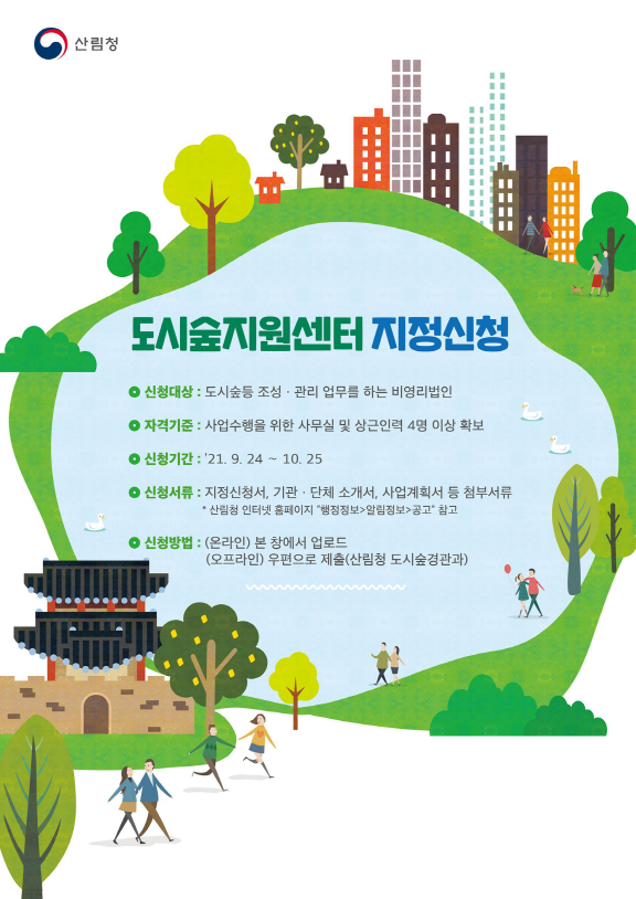 산림청은 도시숲등 조성·관리의 업무를 수행하는 비영리법인을 대상으로 지정신청을 받으면 공정하고 객관적인 지정심사를 위해 지정심사단을 구성하고 1차 서류심사 및 2차 발표심사 등을 거쳐 올해 12월까지 도시숲지원센터를 1~2개 정도 지정·공지할 예정이다.