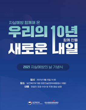 이번 기념식의 주제는 자살예방법 제정 10주년을 맞아 “자살예방을 위해 함께해 온 우리의 10년, 함께 만들 새로운 내일”로 정했으며, 이를 통해 그간의 정책 성과와 자살예방을 위한 우리 사회의 협력 필요성을 강조하였다.