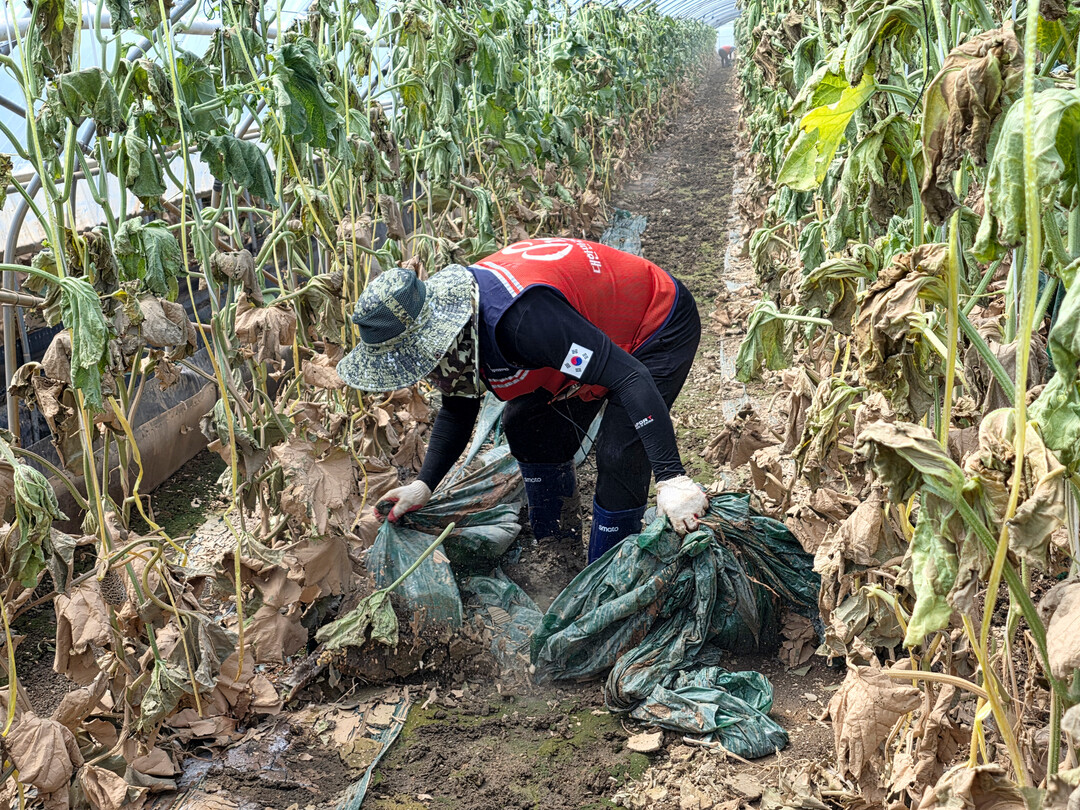 봉사단원들은 진흙탕이 된 비닐하우스를 일일이 쓸어내고, 침수된 농작물을 분류하며 현장 곳곳에서 구슬땀을 흘렸다.