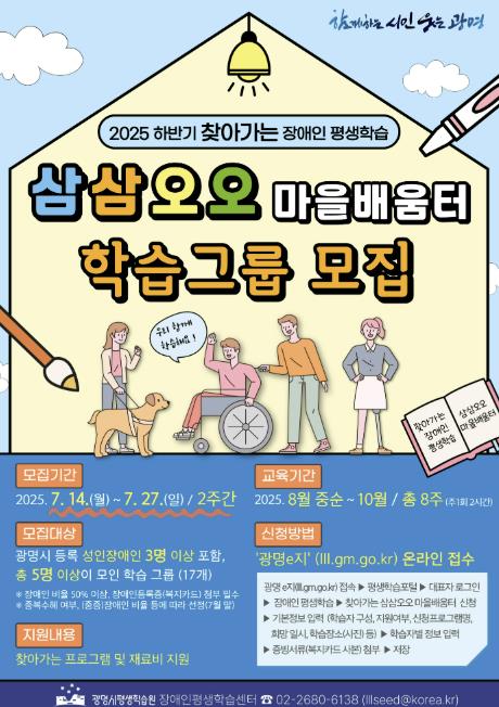 정찬수 평생학습원장은 “삼삼오오 마을배움터는 장애인의 학습 수요를 반영한 맞춤형 프로그램으로 매년 큰 호응을 얻고 있다”며 “앞으로도 장애인이 주체가 되는 평생학습 정책을 지속적으로 확대해 나가겠다”고 밝혔다.
