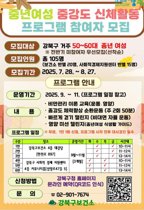 이순희 강북구청장은 “체계적인 운동 프로그램을 통해 중년여성들이 건강하고 자신감 있는 일상을 누릴 수 있도록 지원하겠다”며 “관심 있는 구민들의 적극적인 참여를 바란다”고 밝혔다.