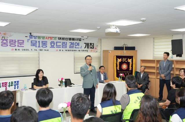지난 7월 16일 묵1동 주민센터에서는 중랑동행사랑넷 어르신돌봄사업의 일환으로 ‘어르신 가족 맺기 효드림 결연식’이 열렸다. 봉사단체 ‘중랑문’ 소속 봉사자 40명과 어르신 20명이 2:1로 결연해 정기적인 방문과 안부 확인을 이어가며 정서적 지지 관계를 형성해 나가기로 했다