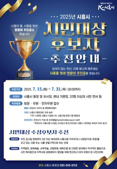신청은 후보자 거주지 관할 동 행정복지센터를 방문하거나 우편(시흥시청 본관 2층 행정과) 또는 전자우편을 통해 할 수 있으며, 후보자에 대한 적격성 조사와 현지 확인을 거쳐, 시민 대상 공적심사위원회에서 최종 수상자 총 3명(개인 또는 단체)을 선정한 뒤 9월 중 개별 통지한다. 시상은 9월 시민의 날 기념식에 실시할 예정이다.