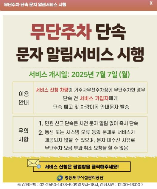 문자알림서비스는 영등포구 시설관리공단 누리집를 통해 신청할 수 있으며, 차량 1대당 1명의 운전자만 가입할 수 있다. 단, 민원 신고에 따른 단속이나 3회 이상 반복된 상습 무단주차 차량은 사전 문자 알림 없이 즉시 단속되므로 주의가 필요하다.