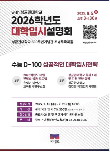 참여를 원하는 수험생과 학부모는 구청 누리집과 종로PICK 애플리케이션(앱)에서 사전 신청하면 된다. 선착순 300명에게는 입시 자료집도 제공한다.