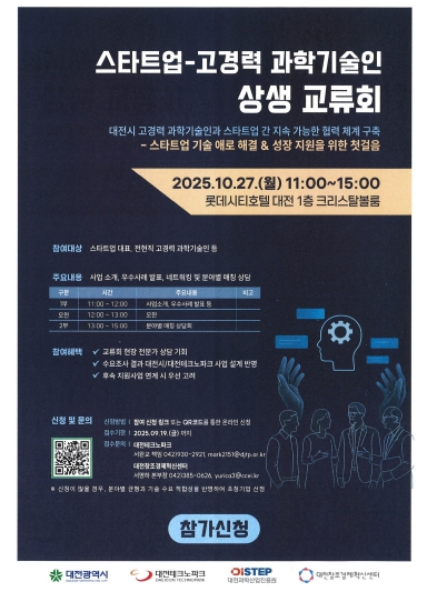 대전시가 지역 스타트업의 기술 애로 해결과 혁신 생태계 강화를 위해'스타트업 고경력 과학기술인 상생 교류회'를 오는 10월 27일(월) 오전 11시 롯데시티호텔에서 개최한다.