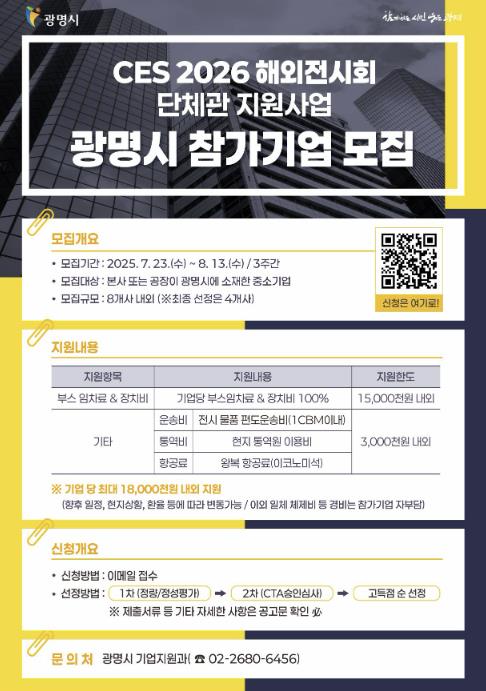 박승원 광명시장은 “이번 지원은 단순한 전시 참가를 넘어, 광명시 기업들의 기술력과 혁신 역량을 세계에 알리고 실질적인 판로 개척과 수출 성과로 이어질 수 있는 중요한 전환점이 될 것”라며 “관내 유망 중소기업들이 적극적으로 참여해 글로벌 무대에서 기술력을 인정받는 기회가 되길 바란다”고 말했다.