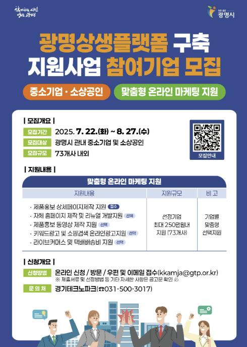 박승원 광명시장은 “이번 사업은 단기적 홍보 지원을 넘어 지역 기업과 소상공인이 지속적인 성장을 이어갈 수 있는 기반을 마련하는 데 목적이 있다”며 “실질적인 판로 확대를 통해 자립 역량을 강화할 수 있도록 지원을 아끼지 않겠다”고 밝혔다.
