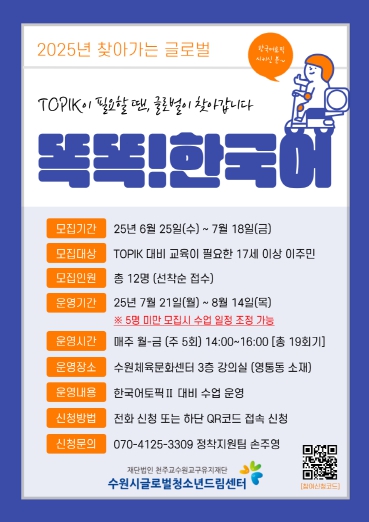 이번 프로그램은 한국어능력시험(TOPIK II)을 준비하는 17세 이상 이주민 12명을 대상으로 진행된다. 수원체육문화센터에서 8월 14일까지 매일 총 19회기로 운영될 예정이다.