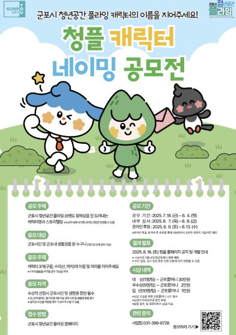 네이밍 대상으로 제시된 캐릭터 디자인은 전문 디자인 플랫폼 공모를 통해 선정됐으며, 군포시와 청플을 상징하는 ▲수리산 ▲구름 ▲까치를 이미지화한 캐릭터 3종에 어울리는 이름과 의미를 자유롭게 창작해 응모할 수 있다.