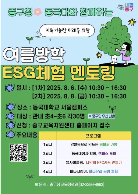이번 프로그램은 8월 6일(1회차)과 8일(2회차), 양일간 동국대학교 캠퍼스에서 열린다. 어린이를 대상으로, 지속가능한 미래의 핵심 요소인 ESG(환경·사회·지배구조)에 대한 쉽고 재미있게 배울 수 있도록 체험 중심의 교육 활동으로 구성됐다.