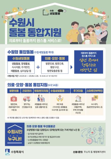 수원시 관계자는 “이번 시범 사업으로 의료, 요양, 돌봄 통합 연계 체계를 구축하겠다”며 “시민들이 나이가 들어도 시설이나 병원에 입소·입원하지 않고, 살던 곳에서 안전하고 건강하게 노후를 보낼 수 있도록 맞춤형 지원을 강화해 나갈 것”이라고 말했다.