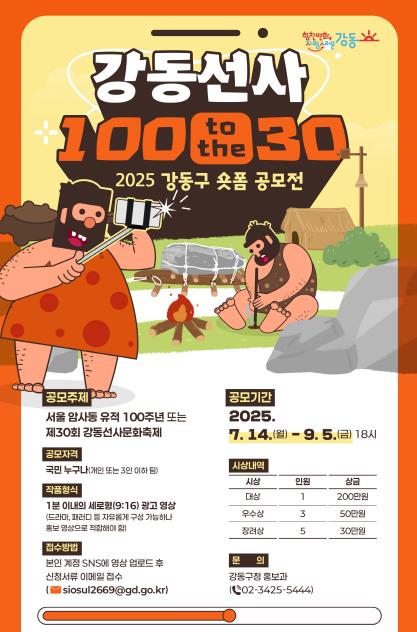 공모 주제는 ‘서울 암사동 유적 100주년’ 또는 ‘제30회 강동선사문화축제’ 중 하나를 선택하여 강동구의 역사적 가치와 지역 축제의 의미를 효과적으로 담은 광고 영상(1분 이내, 세로형)을 제작하면 된다. 드라마, 패러디 등 다양한 형식으로 응모할 수 있고, 개인 또는 팀 단위로 누구나 참여 가능하다.
