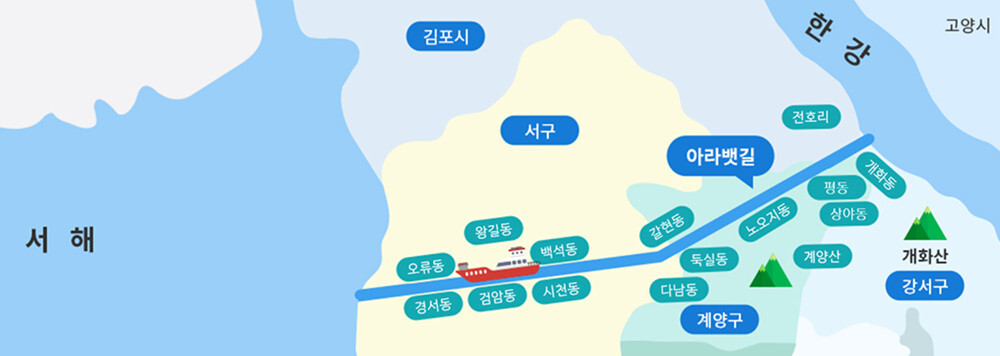 아라뱃길은 서울시, 김포시, 인천시에 걸쳐 흘러갑니다. 행주대교(서울시 강서구 개화동) 인근 아라 한강갑문에서부터 시작하는 물줄기는 김포시를 지나 인천시 계양구를 거쳐 인천시 서구를 통해 바다로 나아갑니다.