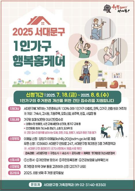 이성헌 서대문구청장은 “1인 가구를 포함한 구민 모두의 안전하고 쾌적한 주거 환경 조성을 위해 앞으로도 최선을 다하겠다”고 말했다.
