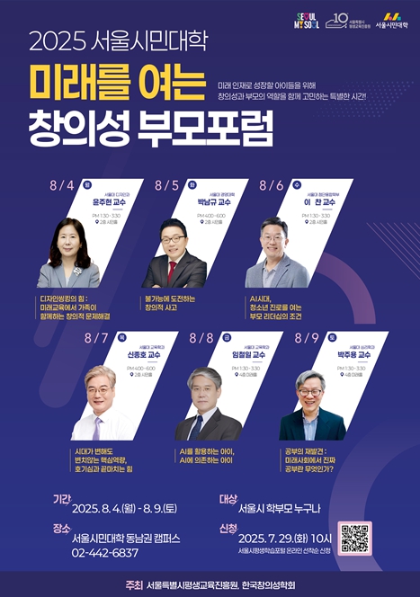 ‘미래를 여는 창의성 부모포럼’은 자녀 교육에 관심 있는 서울 시민 또는 서울 생활권자라면 누구나 무료로 참여할 수 있다. 신청은 7월 29일 오전 10시부터 서울시평생학습포털에서 강의별 선착순 60명씩 접수한다.