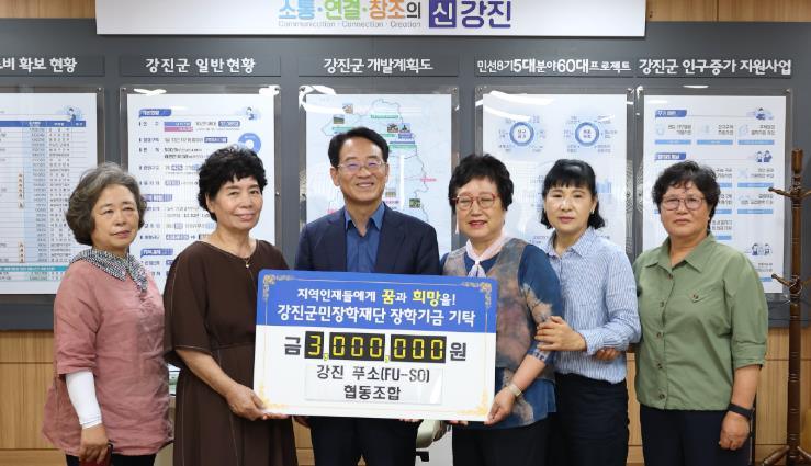 강진원 강진군민장학재단 이사장은 “푸소 협동조합의 따뜻한 나눔에 깊이 감사드리며 이 장학금은 지역 학생들의 꿈을 키우는 데 소중히 사용될 것”이라며 “앞으로도 지역 사회와 함께 인재를 육성하는 기반을 다져나가겠다”고 말했다.