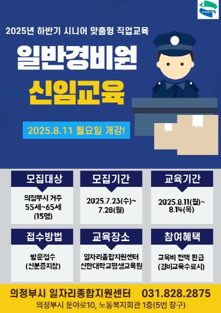모집 대상은 의정부시에 주소를 둔 55세 이상 65세 이하 구직자로, 교육 필요성 및 취업 의지 등을 종합적으로 평가해 15명을 선발할 예정이다. 교육은 8월 11일부터 14일까지 4일간 진행한다.