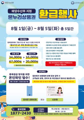 행사 기간 동안 오전 9시부터 오후 5시까지, 국산 수산물을 일정 금액 이상 구매한 소비자에게는 구매 금액의 약 30%에 해당하는 온누리상품권이 환급된다.