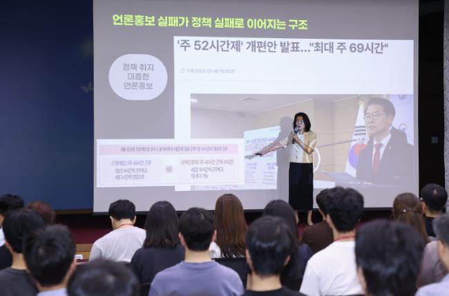 특히, 언론홍보의 핵심인 보도자료 작성법에 관한 강의에서는 ▲기사 구성 방식 ▲문장 표현 요령 ▲제목 작성 전략 ▲사진 선정 등 홍보 효과를 높이는 실무 노하우가 구체적인 예시와 함께 제시되면서 공직자들이 홍보 업무에 바로 활용할 수 있는 실질적인 도움을 제공했다.