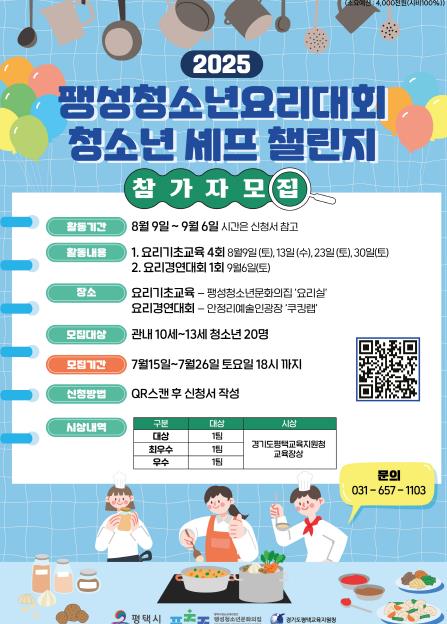 팽성청소년문화의집 프로그램 담당자는 “이번 대회를 통해 다양한 청소년들이 함께 어울리고 자신만의 요리를 선보이는 특별한 경험을 하길 바란다”라며 많은 관심과 참여를 요청했다.