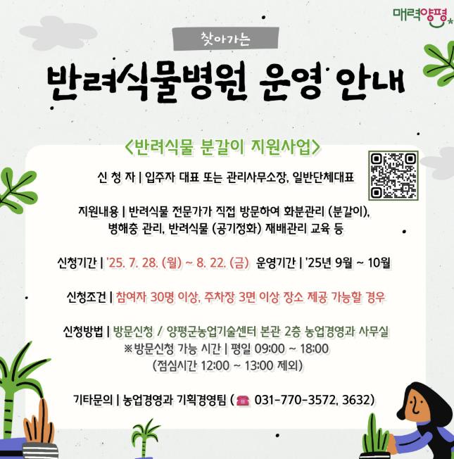 전진선 양평군수는 “반려 식물에 대한 관심이 높아지는 시대 흐름에 맞춰, 실제 현장으로 찾아가는 교육을 통해 주민의 참여도를 높이고자 한다”며, “앞으로도 도시농업의 다양성과 지속가능성을 높일 수 있는 생활밀착형 사업을 꾸준히 추진할 계획”이라고 전했다.