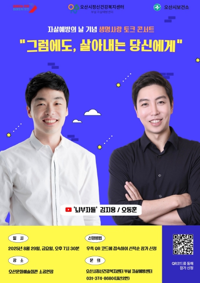 이번 토크 콘서트에는 정신과의 모든 정보 이야기를 다루는 인기 유튜브 채널 ‘뇌부자들’의 김지용, 오동훈 정신건강의학과 전문의가 참여한다. ‘그럼에도, 살아가는 당신에게’라는 주제로 삶의 무게에 지친 이들에게 따뜻한 위로와 공감, 그리고 생명에 대한 메시지를 전할 예정이다.