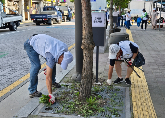 이번 활동은 무더운 날씨 속에서도 장마로 인해 무성하게 자라난 잡초를 집중 제거하고, 큰시장 임시주차장 주변에 방치된 생활쓰레기를 수거하는 등 쾌적한 생활환경 조성에 힘썼다.