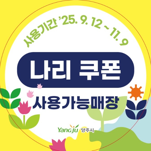 나리쿠폰은 오는 9월 12일부터 11월 9일까지 사용 가능하며, 사용 기간 이후에는 활용이 제한된다. 추가 참여 업소 모집 및 문의는 양주시청 일자리경제과에서 가능하다.