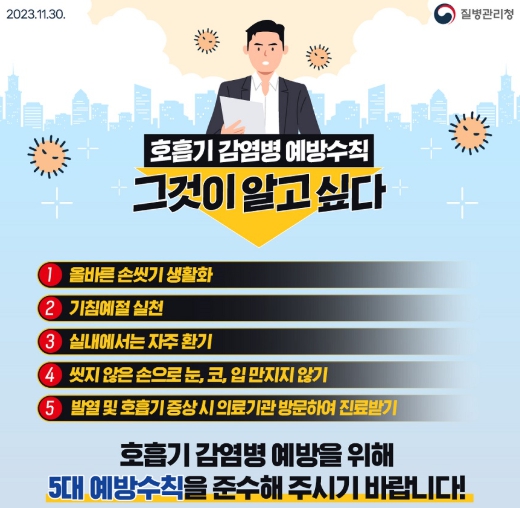 호흡기감염병 예방수칙으로는 △기침·재채기 시 옷소매로 가리기 △30초 이상 비누로 손 씻기 △환기 자주 하기 △증상 발생 시 마스크 착용 및 의료기관 방문 등이 있다.