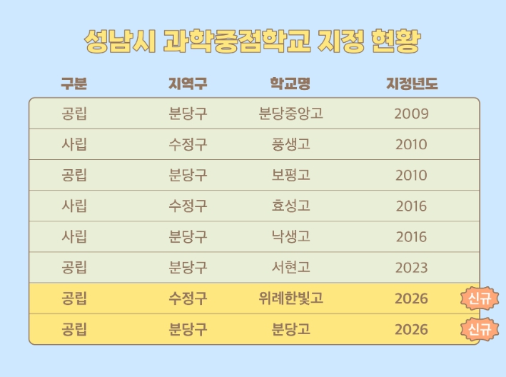 현재 경기도 50개교 과학중점학교 중 성남시에서 6개교가 운영 중으로, 경기도 지자체 가운데 가장 많은 학교가 운영되고 있으며, 이번 신규 지정으로 성남지역 과학중점고는 총 8개교로 늘었다.