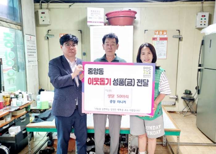 중앙마니커로부터 기증받은 생닭은 다음 날인 15일, 중앙동 관내 5개 경로당에 배부됐다.