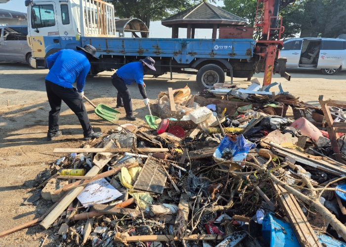 25일 시에 따르면, 80여명의 안양시 재난재해봉사단은 이날 예산군 신암면을 찾아가 집게차, 살수차 등 복구 장비를 투입해 폭우로 폐허가 되어버린 비닐하우스의 잔재를 치우고, 망가진 농작물을 수거하는 등 농가의 피해를 신속하게 복구하는데 힘을 모았다.