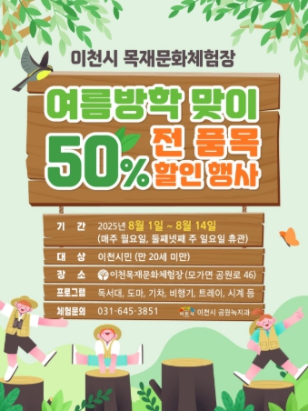 이번 행사는 8월 1일부터 8월 14일까지 이천시 목재문화체험장(이천시 모가면 공원로 46)에서 진행되며, 관내 어린이 및 청소년(만 20세 미만)을 대상으로 한다.