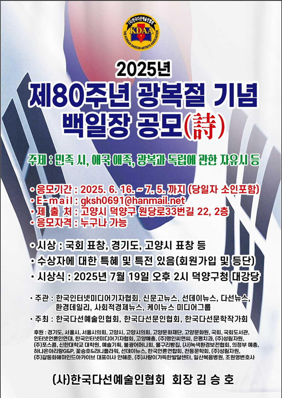 한국다선문인협회는 제80주년 광복절을 앞두고 백일장 민족시 부문을 공모한다.