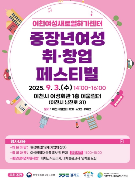 플리마켓은 오전 11시부터 오후 4시, 채용관은 오후 2시부터 4시까지 운영되며, 이천시에 거주하는 여성이라면 누구나 참여할 수 있다. 구직 희망자는 당일 현장 접수를 통해 채용 면접에 참여할 수 있다.