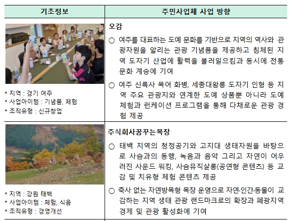 문체부 정책 담당자는 “올해 새롭게 선정된 주민사업체가 관광두레를 통해 지역을 대표하는 브랜드로 성장할 수 있도록 적극 지원해 나가겠다.”라고 밝혔다.