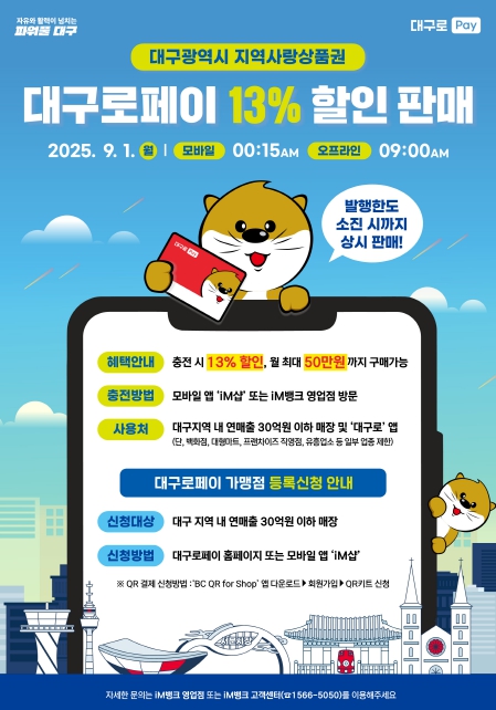 또한, 9월 한 달간 대구로페이 보유 한도를 100만 원으로 상향 조정해 8월에 7% 할인으로 50만 원을 충전한 시민들도 13% 할인 혜택을 온전히 누릴 수 있도록 한다.