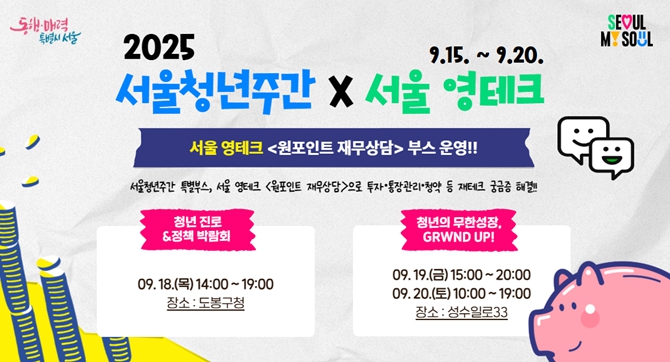한편, 서울시는 청년주간(9.15~9.20)을 맞아 청년 현장으로 찾아가는 ‘영테크 재무상담’을 3회 개최한다고 밝혔다. 9월 18일(목)에는 도봉구청에서 열리는 ‘청년 진로&정책 박람회’에서, 9월 19일부터 20일 양일간은 성수일로33에서 개최되는 2025 서울청년주간 '청년의 무한 성장, 그라운드 업(GRWND UP)!'에서 진행된다.