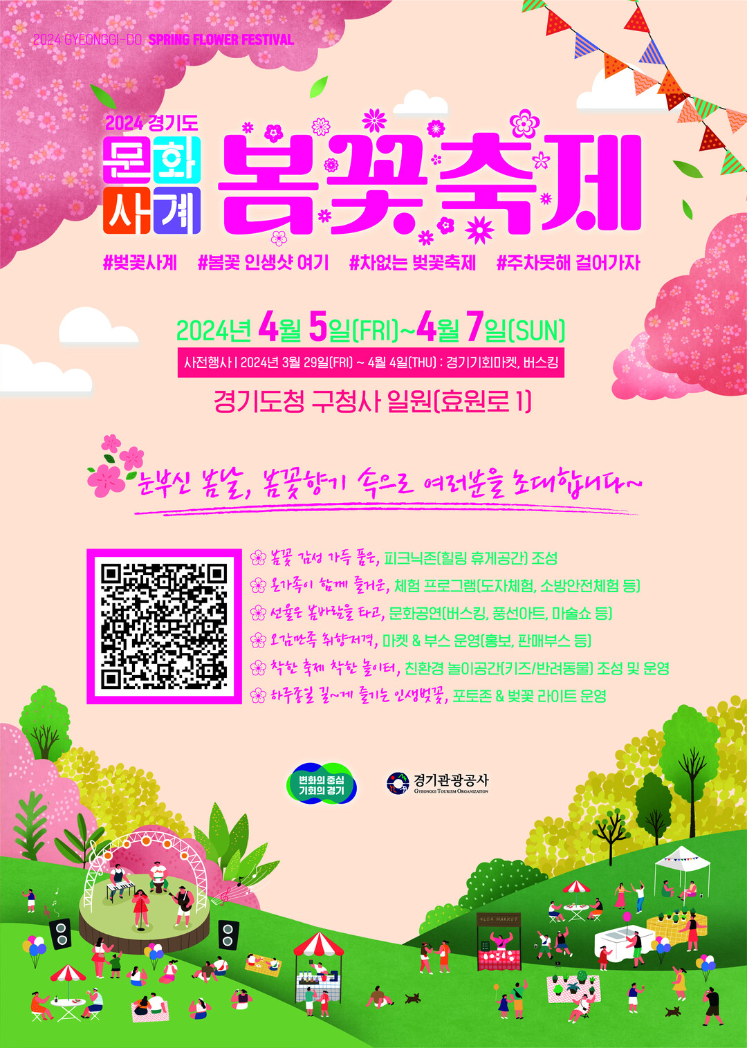 경기도와 경기관광공사(이하 공사)가 올해 38회째로 경기도 대표 문화축제로 자리매김한 ‘경기도 문화사계’행사 中 하나인 ‘봄꽃 축제’를 오는 4월 5일부터 7일까지 경기도청 구청사 일원(수원시 팔달구 효원로 1)에서 개최한다.