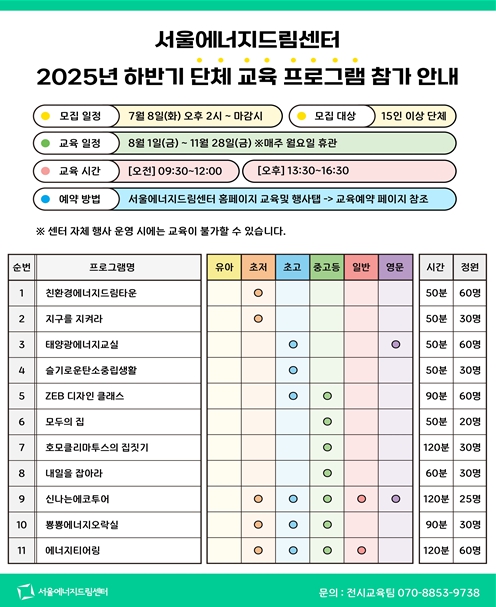 이와 함께 8월 1일(금)부터는 총 11종의 정규 단체 교육 프로그램이 운영된다. ‘친환경 에너지 드림타운’, ‘지구를 지켜라’, ‘슬기로운 탄소중립생활’, ‘태양광에너지교실’ 등 초등학생 대상 프로그램을 통해 에너지 전환과 탄소중립의 개념을 체험할 수 있다. 이 중 ‘태양광에너지교실’은 태양광 미니카 제작을 통해 재생에너지 원리를 배우는 유료 프로그램이다.